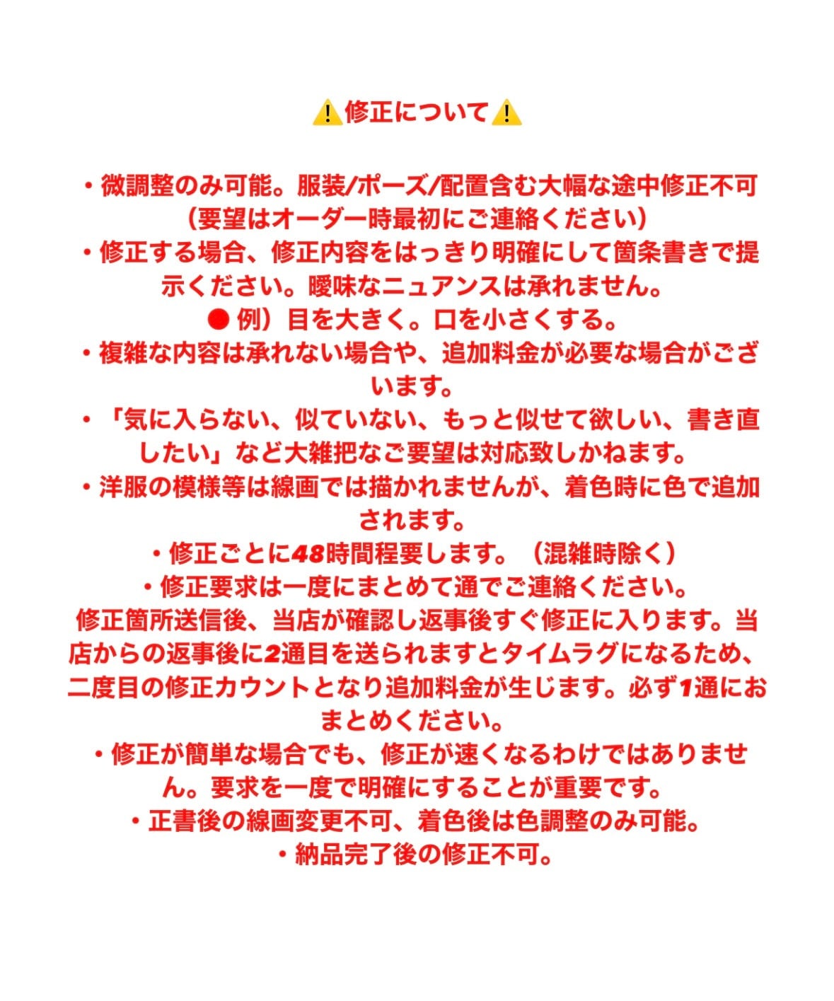 ・修正には48時間程かかります。まとめて1回でご依頼ください