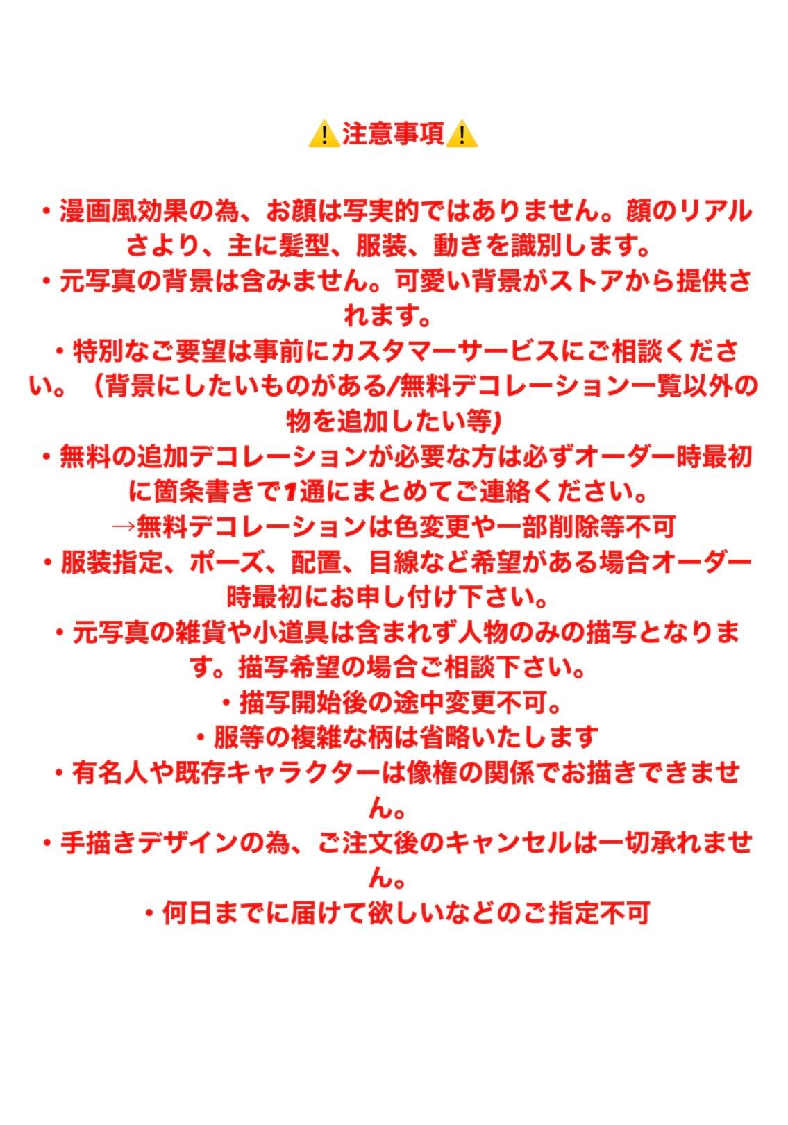 ・イラストは公式SNSにてご紹介させて頂く場合がございます。基本的にSNSご掲載不可のご注文は承っておらず、掲載可能な方のみご注文を承っております。ご都合によりどうしてもご掲載不可にてオーダーご希望の場合、ご連絡下さいませ。※別途掲載不可料が発生致します。