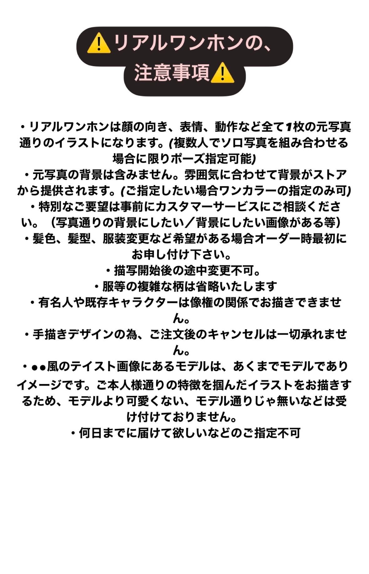 ・イラストは公式SNSにてご紹介させて頂く場合がございます。基本的にSNSご掲載不可のご注文は承っておらず、掲載可能な方のみご注文を承っております。ご都合によりどうしてもご掲載不可にてオーダーご希望の場合、ご連絡下さいませ。※別途掲載不可料が発生致します。
